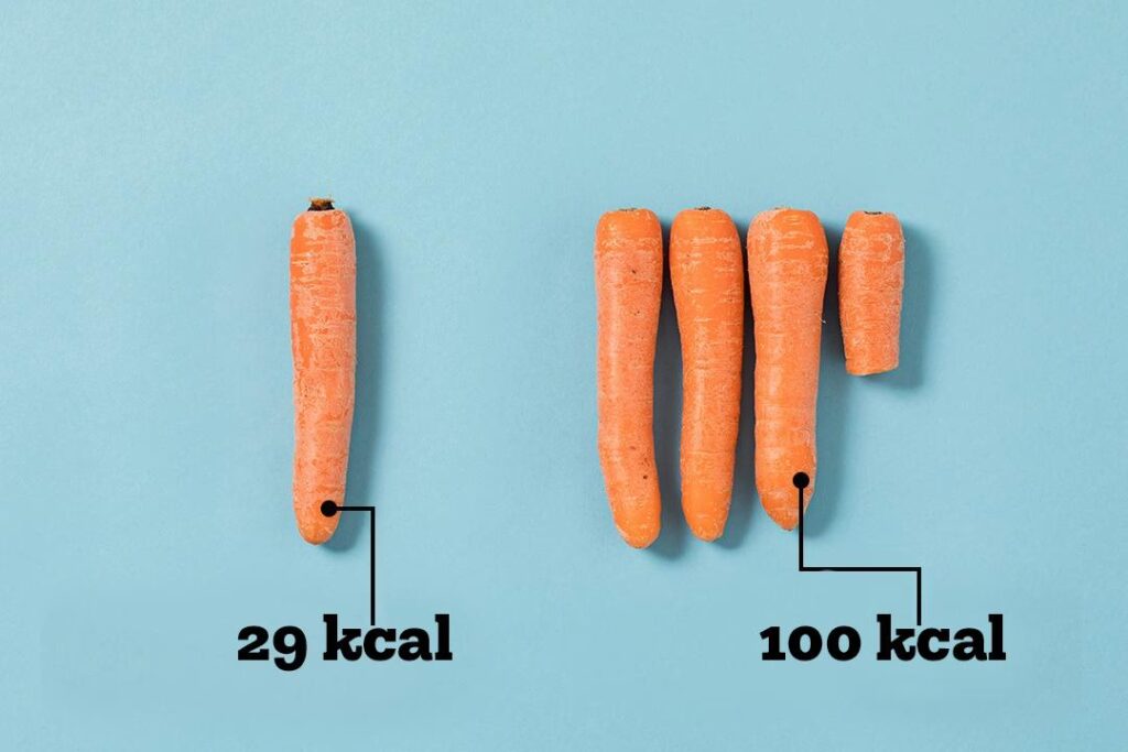 Når du spiser 100 kalorier slik, får du en hurtig energiboost, men du vil sandsynligvis føle dig sulten igen kort tid efter. Kroppen har knap registreret, at den har fået mad, fordi mængden var så lille. Spiser du derimod 100 kalorier fra grøntsager, fylder det betydeligt mere i maven, og du vil føle dig mæt i længere tid. Dette er grunden til, at Majbritt Louring Engell oplever, at klienter bliver overraskede over, hvor meget de rent faktisk skal spise af de 'rigtige' fødevarer for at blive mætte og samtidig ligge i kalorieunderskud for vægttab.