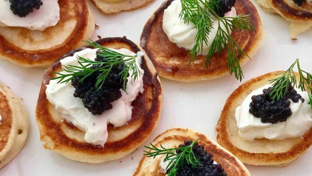 - Creme fraiche toppet med kaviar (stenbiderrogn, lakserogn eller ægte kaviar for en luksuriøs version) og finthakket rødløg.