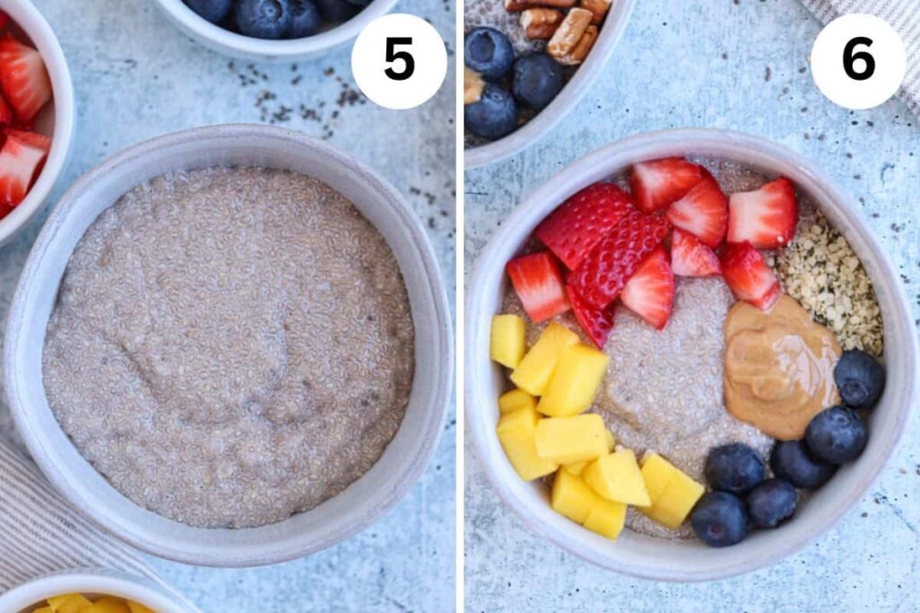 4. Tilpas konsistensen: Hvis smoothien er for tyk efter den første blending, kan du tilføje lidt mere mandeldrik, en spiseskefuld ad gangen, og blende igen, indtil du opnår den ønskede konsistens. Nogle foretrækker en meget tyk, næsten ske-venlig smoothie, mens andre ønsker en mere flydende drik. Chiafrøene vil fortsætte med at absorbere væske og tykne smoothien en smule, selv efter blending, hvis den står et stykke tid.