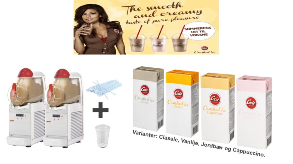 | Mini | 575 kr. | ca. 20 | 1x6L maskine, 3L Cocio Crushed Ice koncentrat (giver 5L færdig drik), 50 plastkrus & sugerør | Op til 5 dage | Ekstra is: 40 kr./L, Inkl. slutrengøring |