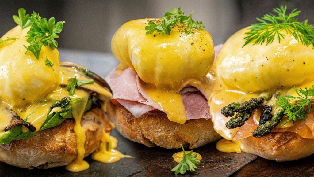 Alle tre retter serveres med et pocheret æg og toppes (eller bundes) med cremet Hollandaisesauce.