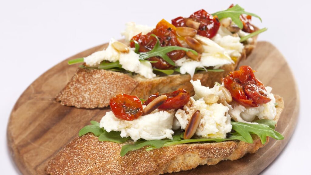 Burrata: En ydre skal lavet af mozzarella, der er formet til en pose og fyldt med en blanding af stracciatella (strimler af mozzarella) og fløde. Når den skæres i, flyder den cremede, rige indre ud. Burrata har en rigere, mere smøragtig kerne sammenlignet med mozzarellaens ensartede blødhed. Den nydes typisk rå for at værdsætte den unikke teksturkontrast mellem den faste skal og det flydende indre.