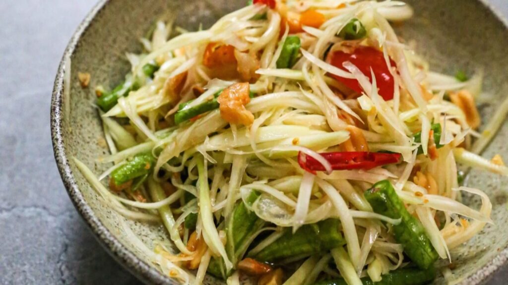 Grøn papaya er en hjørnesten i mange sydøstasiatiske køkkener. Den mest berømte ret er sandsynligvis Som Tum, en krydret salat fra Thailand og Laos, hvor strimlet grøn papaya stødes sammen med hvidløg, chili, bønner, tomater, jordnødder, fiskesauce, limejuice og palmesukker i en morter. Resultatet er en eksplosion af smag – surt, sødt, sprødt, stærkt og salt – alt sammen i én bid.