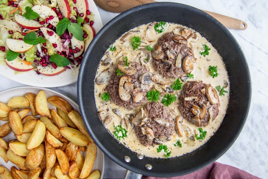 - Minimer tilsat fedt: Steg på en god non-stick pande med kun en lille smule sund olie (f.eks. rapsolie eller olivenolie), eller grill/bag bøfferne.