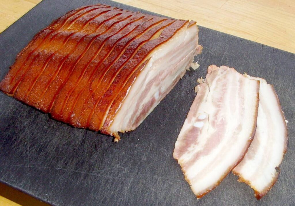 - Dansk bacon: Typisk fremstillet af svinebryst, ofte ved stiksaltning.