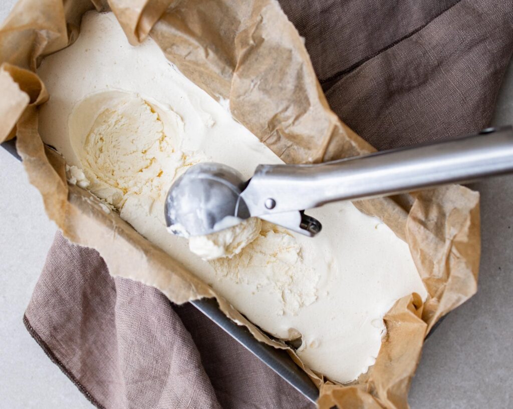 Det er helt normalt, at hjemmelavet is, især uden stabilisatorer, bliver ret hård, når den er fuldt frossen. Den bedste måde at løse dette på er at lade isen temperere. Tag den ud af fryseren og stil den i køleskabet i cirka 15-30 minutter (tiden afhænger af mængden og temperaturen i dit køleskab). Isen vil bløde lidt op, blive nemmere at scoope og få en mere behagelig spisekonsistens.