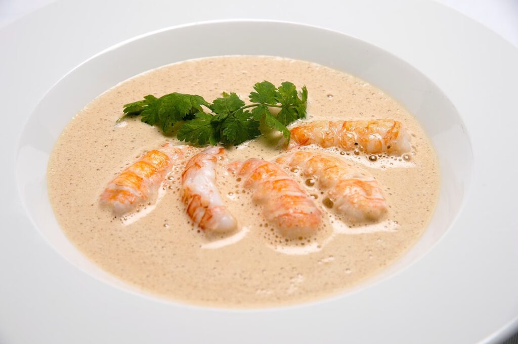 Efter at skaller og grøntsager har simret længe i vin og fond, sies suppen grundigt. Til sidst tilsættes fløde, som giver bisquen dens signatur cremede konsistens og runde smag. Nogle opskrifter bruger også en smørbolle (roux) eller ris for at tykne suppen yderligere, men fløden er nøglen til den luksuriøse finish.