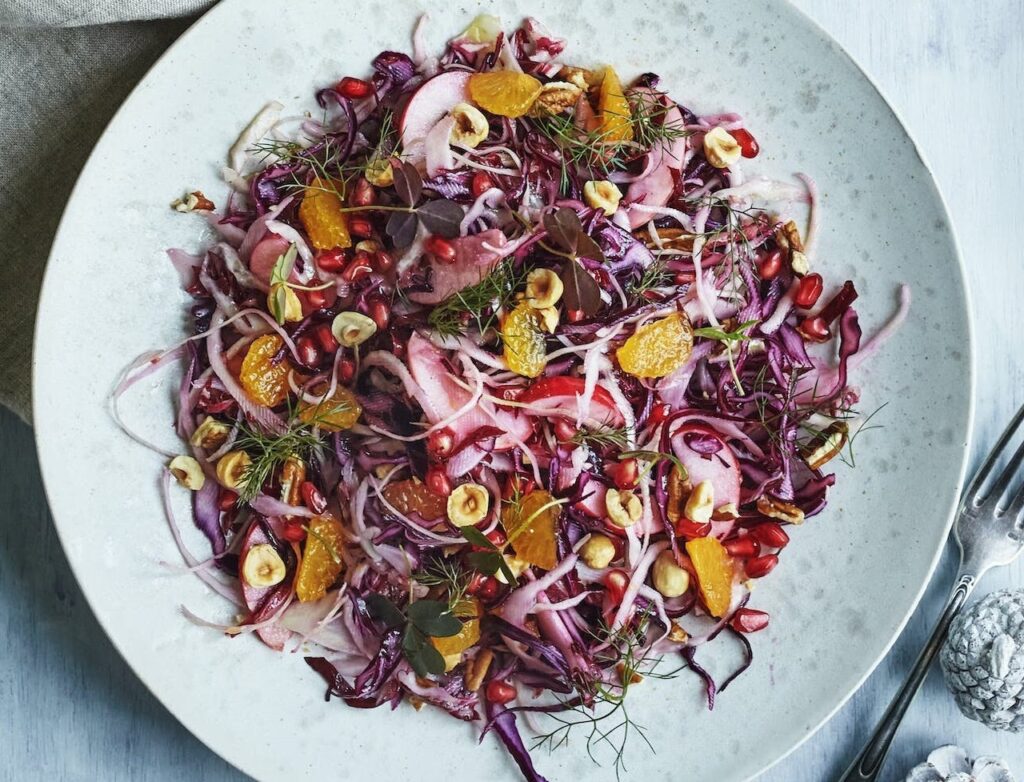 • Med Frugt: Julesalat, appelsinstykker, valnødder og en let vinaigrette. Appelsinens sødme og syre balancerer bitterheden.