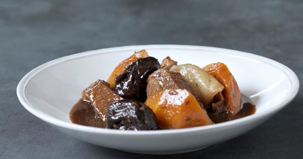 - Kalveragout: En varmende gryderet med tern af kalveklump, grøntsager som gulerødder, selleri og løg, simret i en smagfuld sauce.