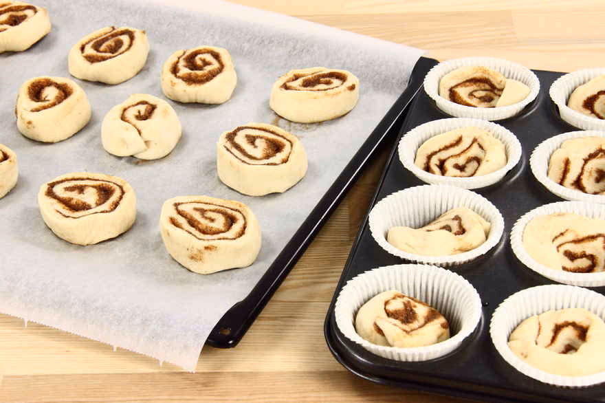 - Formning: Den udrullede dej med fyld rulles stramt sammen til en lang pølse. Det er vigtigt, at rullen er stram, så fyldet ikke løber ud under bagningen, og så sneglene holder formen. Rullen skæres derefter ud i skiver – kanelsnegle. Tykkelsen på skiverne bestemmer størrelsen på dine snegle.