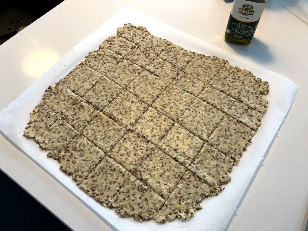 - Bag knækbrødene i en forvarmet ovn ved 180°C (almindelig ovn) i 12-15 minutter. Hold øje med dem – bagetiden kan variere afhængig af din ovn og hvor tyndt du har rullet dejen. De er færdige, når de har en flot, jævn, gylden farve over det hele.