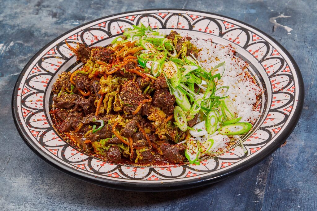 Forestil dig en skål med dampende ris i bunden. Ovenpå arrangeres smukt forskellige elementer: sauteret spinat, marinerede svampe (f.eks. sojastegte svampe), friske bønnespirer, strimler af mørt oksekød, en generøs portion Kimchi, og kronen på værket – et perfekt stegt æg med en flydende blomme. Når du blander det hele sammen med den spicy gochujang-sauce, eksploderer smagene i munden. Kimchiens syrlighed og bid er essentielle for at skabe den autentiske Bibimbap-oplevelse.