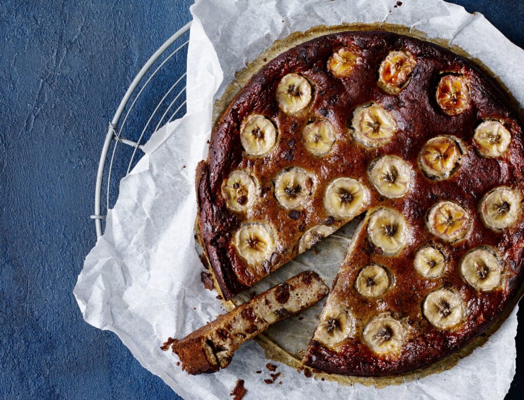 - Skær de sidste 2 bananer over på langs og læg dem oven på kagedejen som pynt.