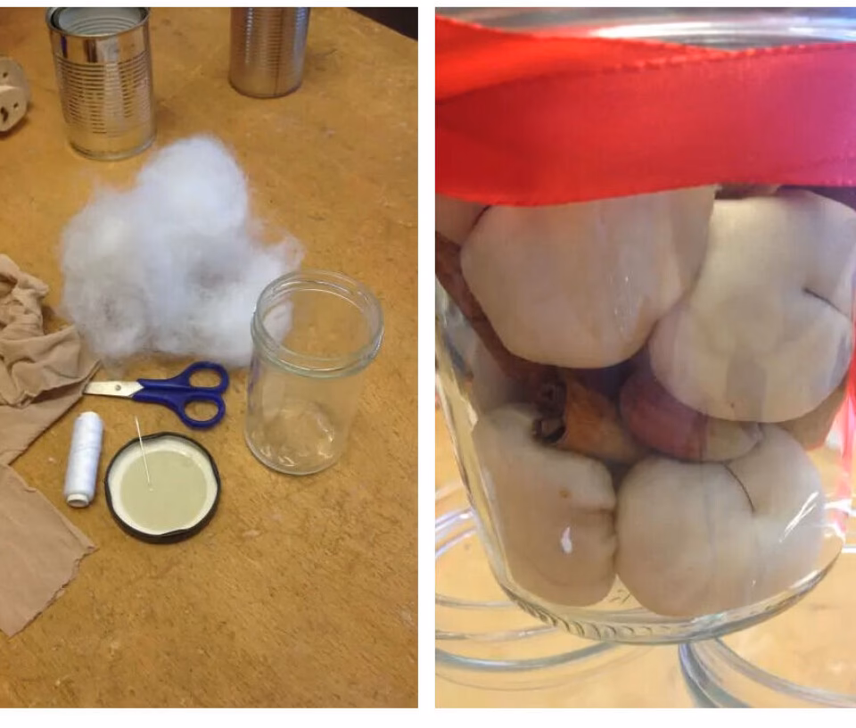 "Dem laver man nogle stykker af og putter dem ned i et syltetøjsglas sammen med julekrydderi og måske et stykke appelsinskal eller andet, man bruger, når man sylter. Man sætter låg på, og så kan man dekorere med et flot stykke julestof, som man sætter over med et fint bånd eller snor.