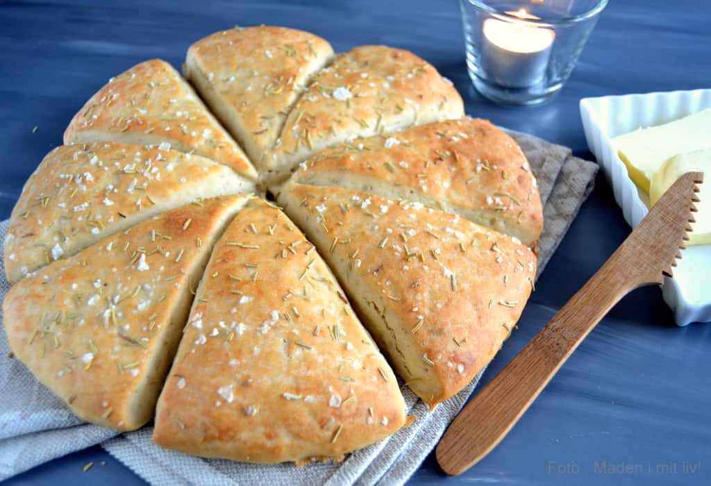 A: Focacciaen er færdig, når overfladen er flot gyldenbrun, og den lyder hult, når du banker let på bunden. Bagetiden er typisk 20-25 minutter ved 220 grader, men hold øje med brødet, da ovne kan variere.
