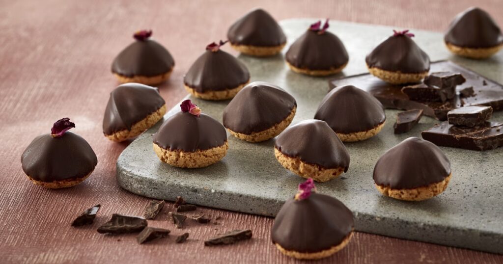 - Hvis du ønsker at pynte kagerne med krymmel, frysetørrede bær eller lignende, skal det gøres med det samme, mens chokoladen stadig er våd.