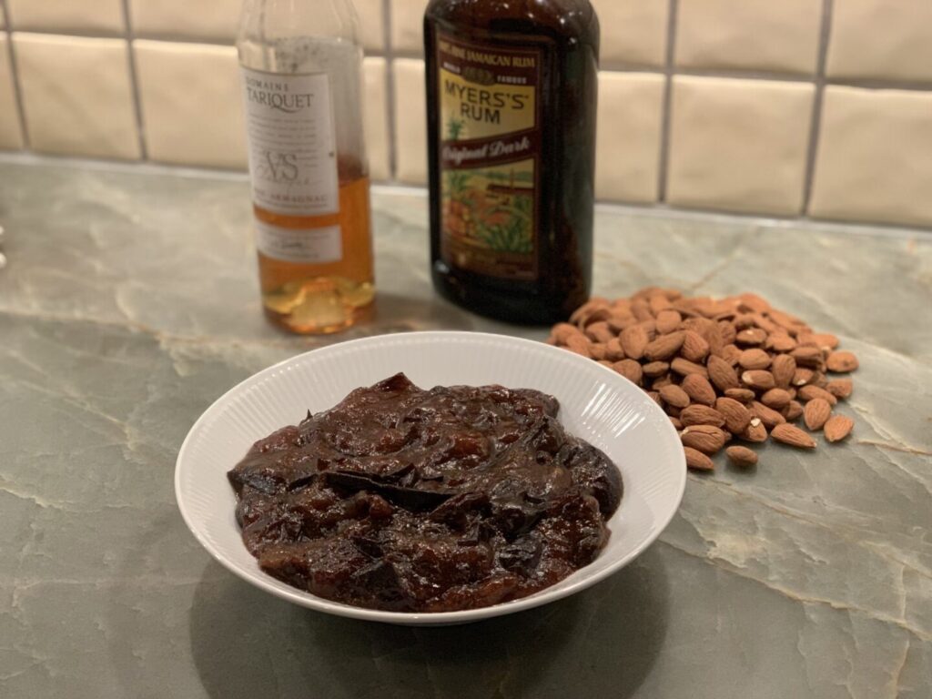 | Sveskeroulade (creme) | 2-6 timer (afhængig af sveske) | Sherry og kogende vand | Blødgøring for at fjerne sten og hakke/blende |