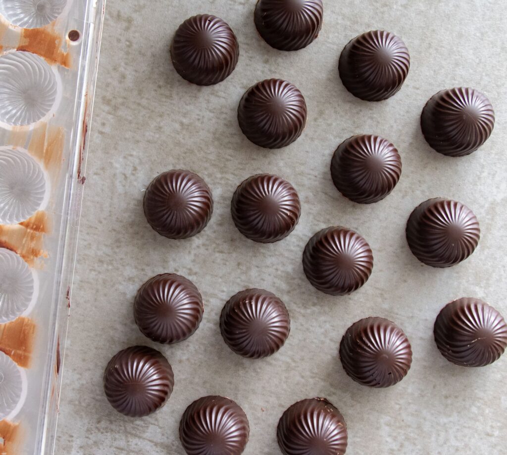 Når chokoladerne er fyldt og lukket, er det tid til at lade dem stivne helt. Korrekt Afkøling er lige så vigtig som tempereringen for at sikre, at chokoladen trækker sig sammen og slipper formen.