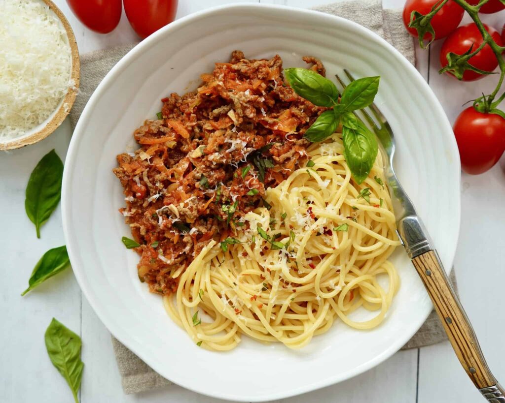 Selvom retten hedder spaghetti bolognese, bruger italienerne sjældent spaghetti til deres ragú. Den traditionelle pasta er tagliatelle eller en anden bred, flad pasta som fettuccine eller papardelle. Hvorfor? Fordi den brede overflade giver saucen meget mere at klæbe sig til, hvilket sikrer, at hver bid pasta er dækket af den lækre kødsovs. Når du koger pastaen, så kog den al dente – hellere 1 minut for lidt end for meget. Den vil fortsætte med at tilberede en smule, når den blandes med den varme sauce.