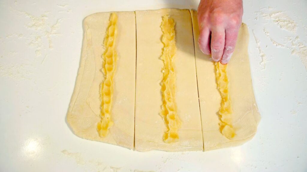 - Mængden af fyld: Vær ikke bange for at bruge en god mængde remonce. Det er remoncen, der gør bagværket saftigt og lækkert. Fordel den jævnt på dejen.