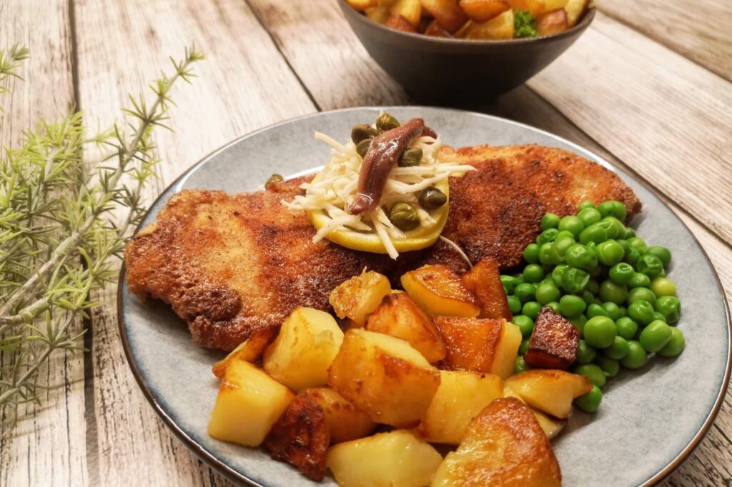 En traditionel schnitzel serveres ofte med brasede kartofler, ærter og løg, samt citron og kapers. Den medfølgende opskrift giver inspiration til dette klassiske tilbehør.