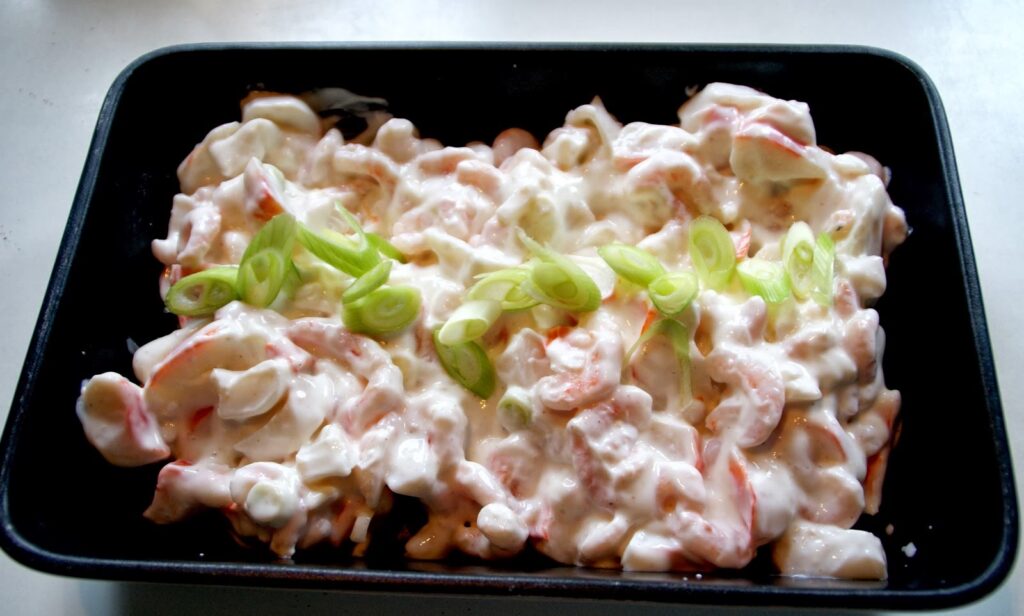 - Smagsstoffer, farvestoffer og krydderier for at give produktet den ønskede smag, farve og udseende (f.eks. krabbearoma og rød farve).